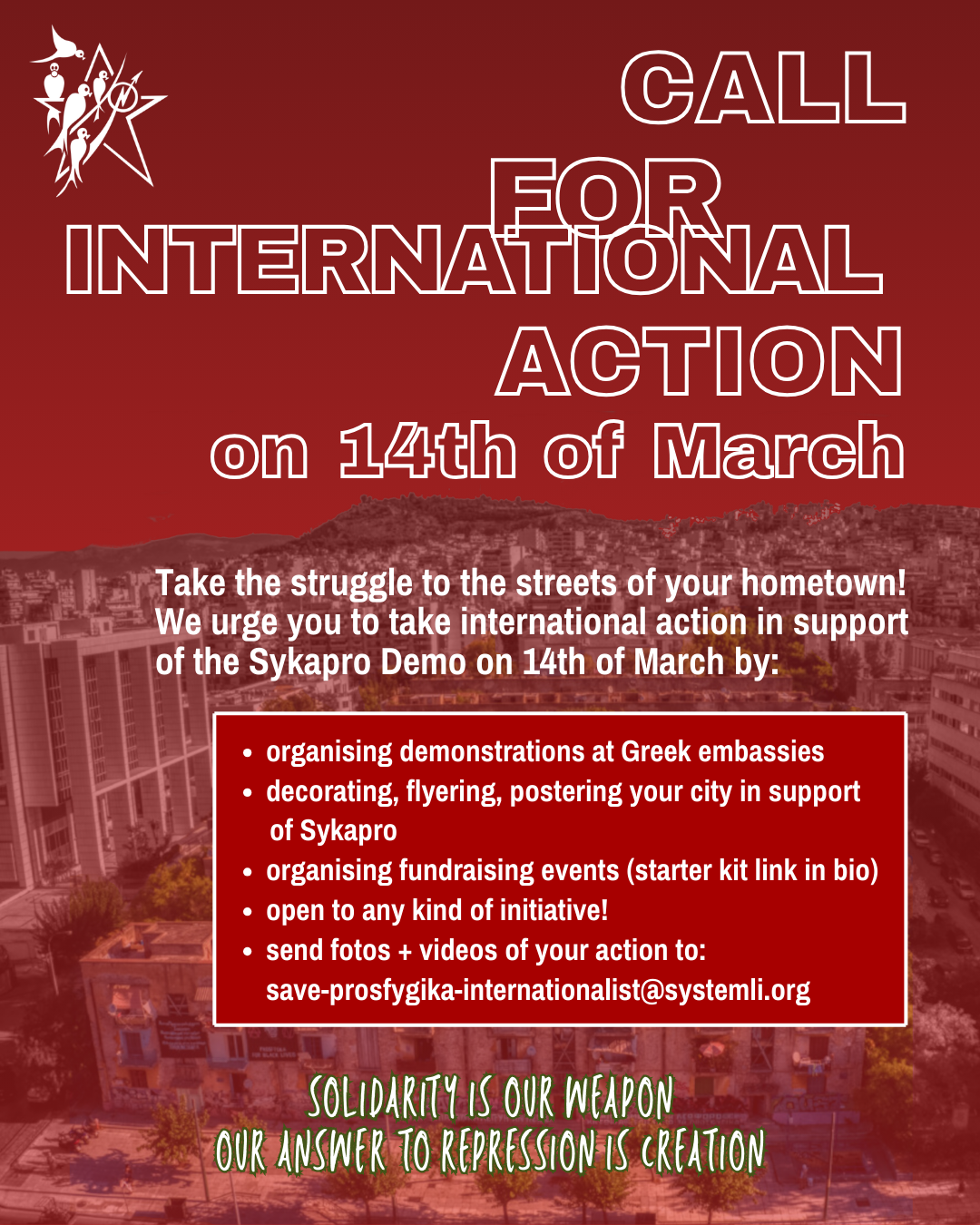 In this spirit of resistance we call for everyone to engage in actions of solidarity on the same day, to show the Greek state and Europe that this is our common struggle and we will win!