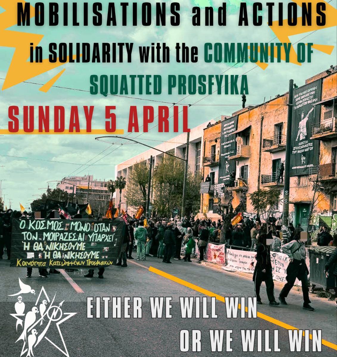 In Athens we are mobilizing for a central demonstration on the 5th of April. Internationally, we call all people who are for the defense of life to initiate or participate in solidarity actions to promote the panhellenic and international actions on the this same day, in solidarity with the Community of Squatted Prosfygika.